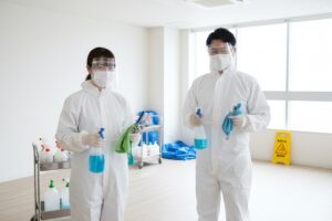感染症のリスクがある現場では、作業前に消毒を行い、安全を確保してから本格的な清掃に入ります。